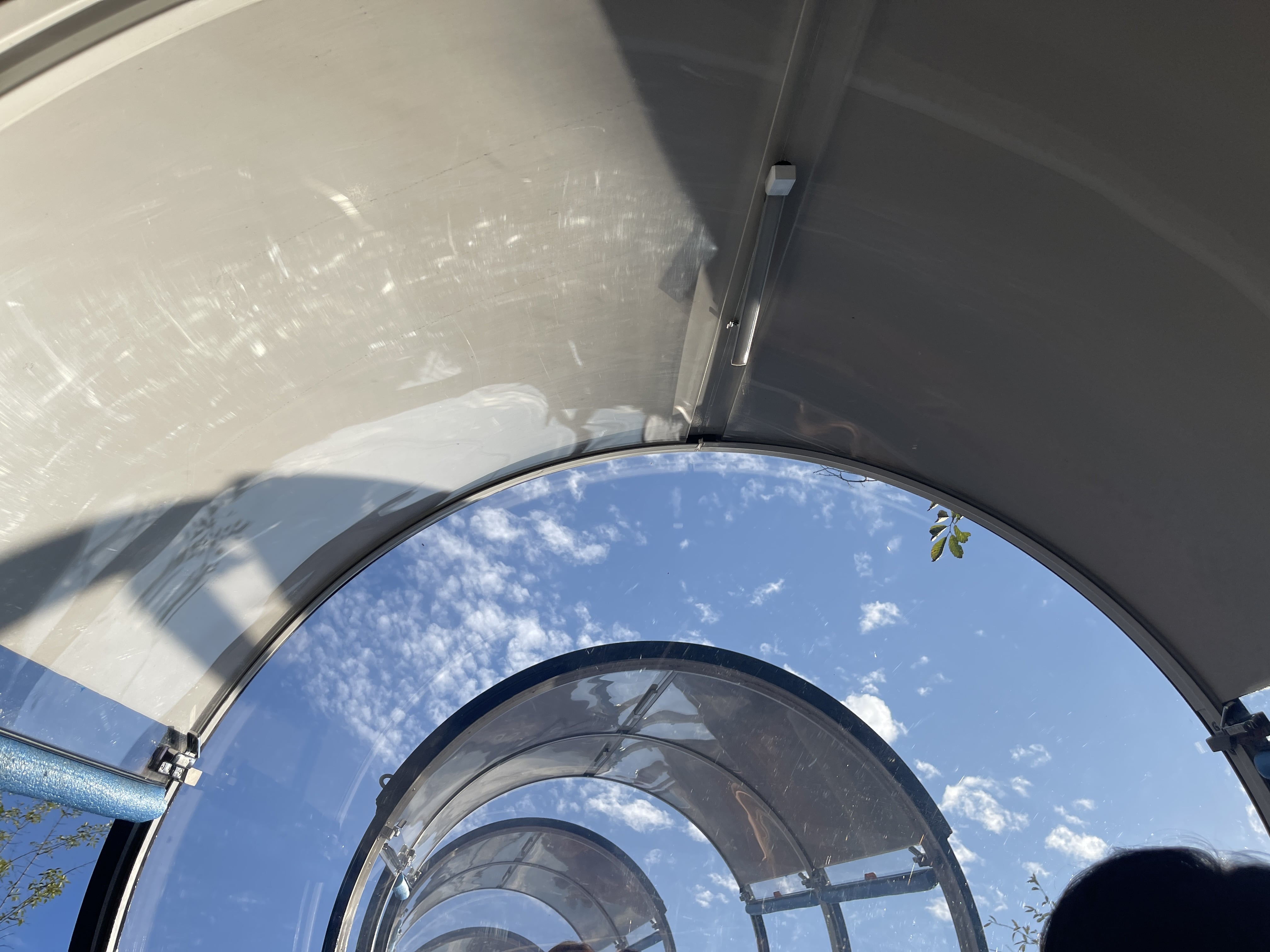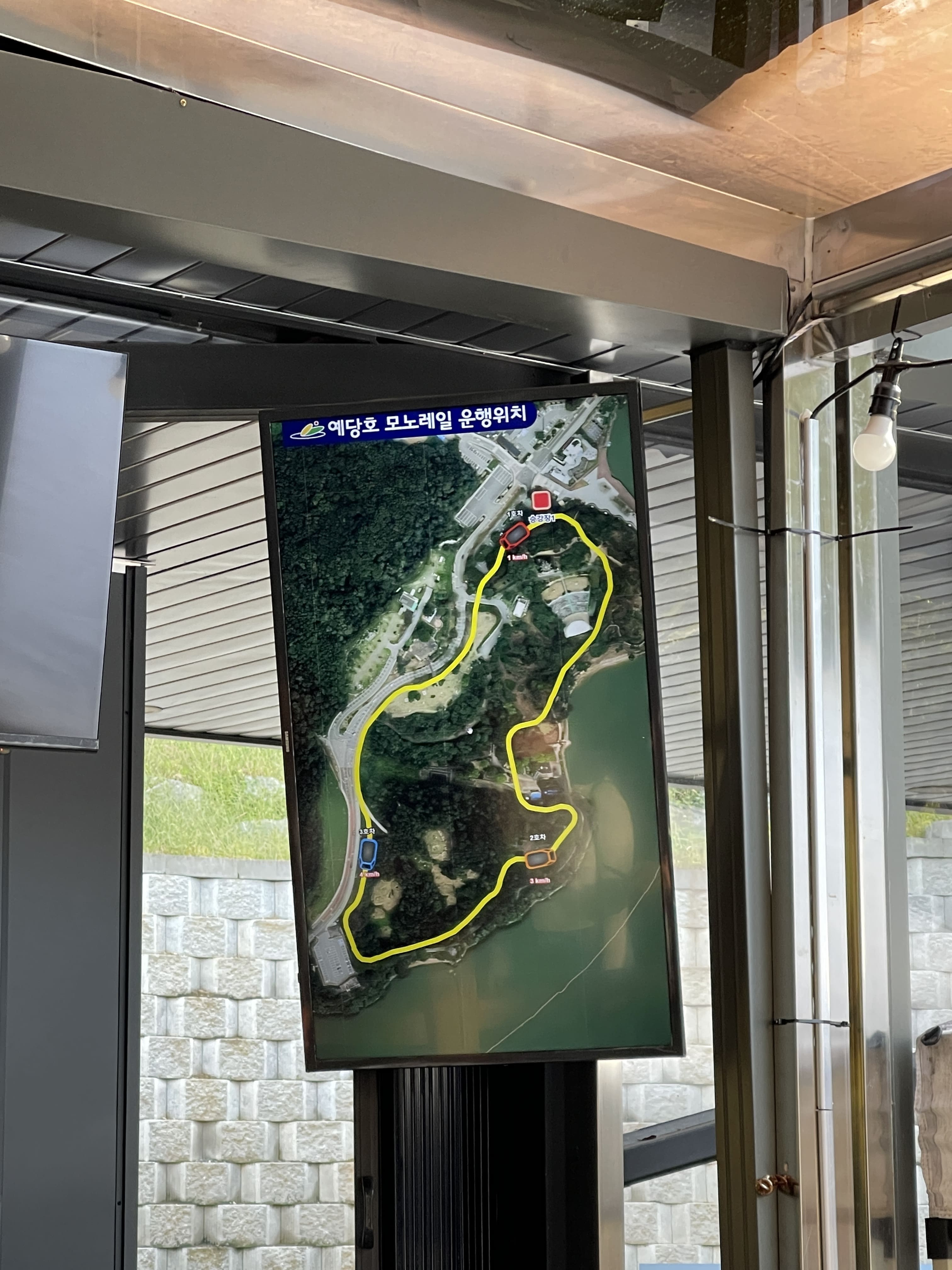 순서가 와서 대기석에 앉아 있으면 모니터를 통해 모노레일을 확인할 수 있다. 총 3대를 운영. 고정 화면이 아니라 모노레일 위치가 계속 움직인다.